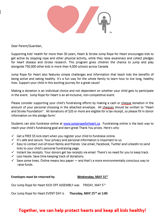 Help our school raise heart awareness and money for the canadian heart association by participating in jump rope for heart.